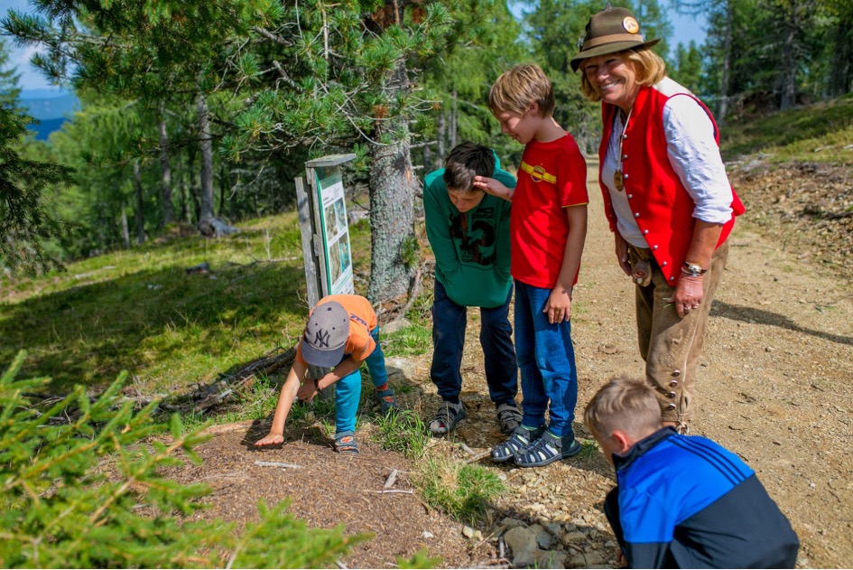 Bei der geführten Wanderung über unseren Almwanderweg mit vielen Farb Schautafeln erklären wir viel Interessantes von der Waldameise über die Zirbe bis zur Mutterkuh mit Kalb.